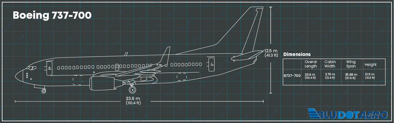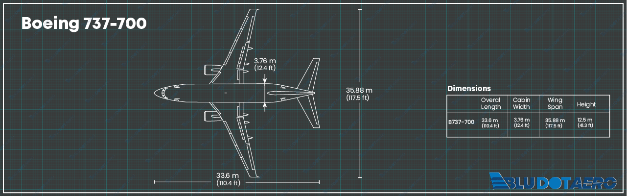 B737-700 Series : The B737-700 is a midsize-fuselage member of B737-NG Family featuring seats arranged on a single aisle permitting up to six-abreast seating in a cabin below four meters (13 ft) of width.. The aircraft shares the same cockpit and utilizes common flight controls and cabin management systems as other aircraft in the B737-NG class. This consistency makes life easier for pilots and cabin crew and allows them to focus on looking after passengers. Cockpit commonality reduces training, maintenance costs and maximize parts interoperability. The Typical B737-700 seating arrangement is 126 to 149 passengers, with a maximum capacity of up to 160 travelers. The 737-700BCF can transport up to 21.0t of cargo. The volume limit payload capacity of the aircraft is 16.80t.